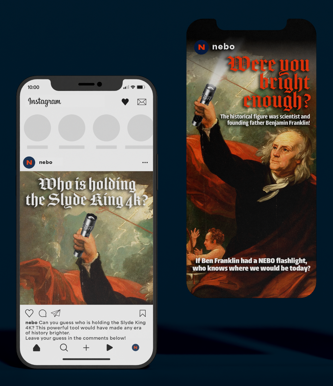 A series of posts on Instagram in which users can engage with NEBO through a series of guessing games. This series features square posts of zoomed-in images of historical figures holding a Slyde King 4k, giving customers a chance to guess who the figure is. The answer will then be posted to NEBO’s story the next day, asking users if they were “bright enough” to make the guess.